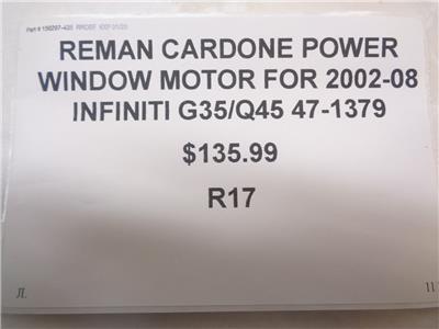 REMAN CARDONE POWER WINDOW MOTOR FOR 2002-08 INFINITI G35/145 47-1379